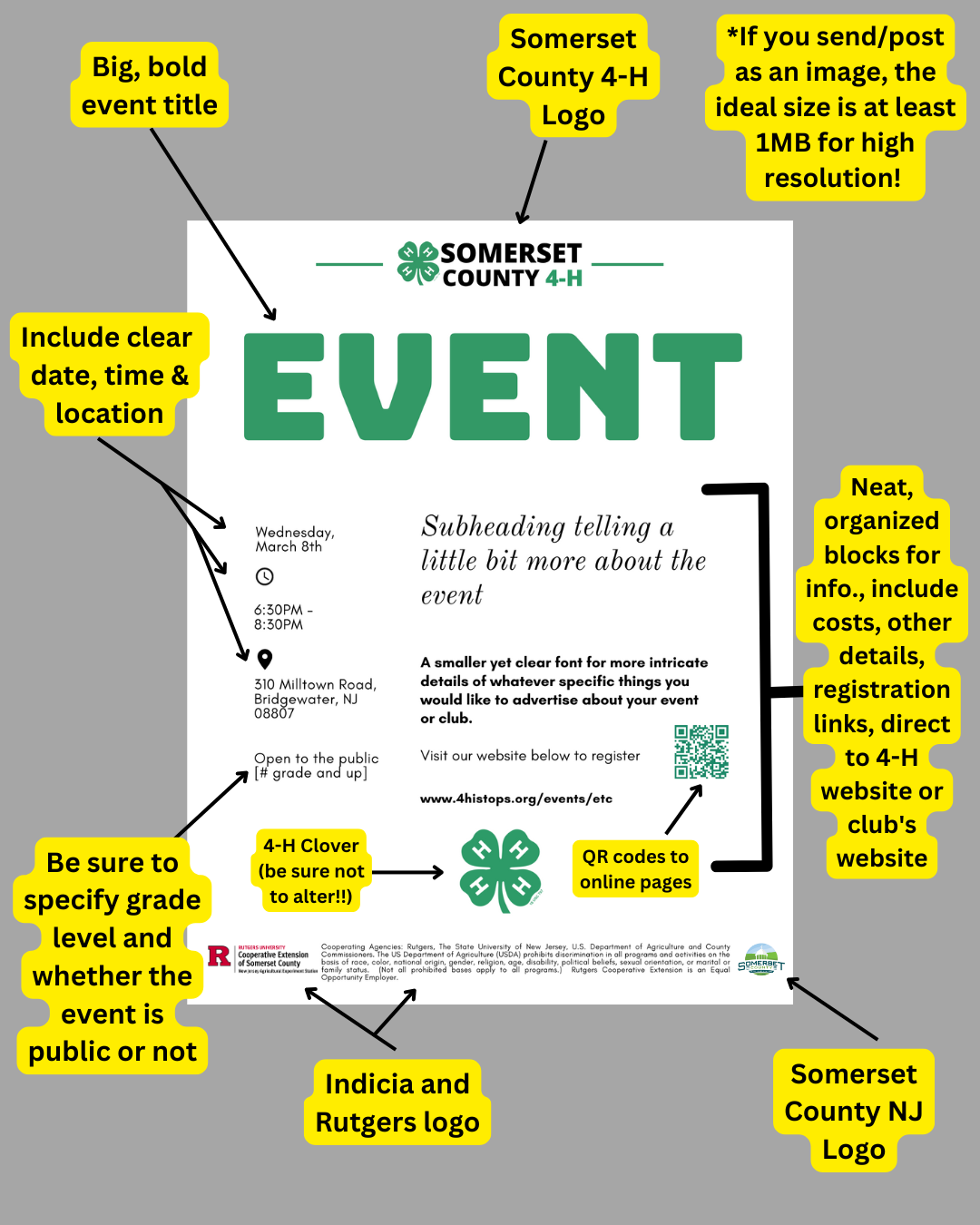 When creating a flyer for your club/club event, be descriptive, specific, and creative! Remember to put all details such as the date/time, address, cost (if any), and contact info/important links. To get some ideas please see this example flyer below!